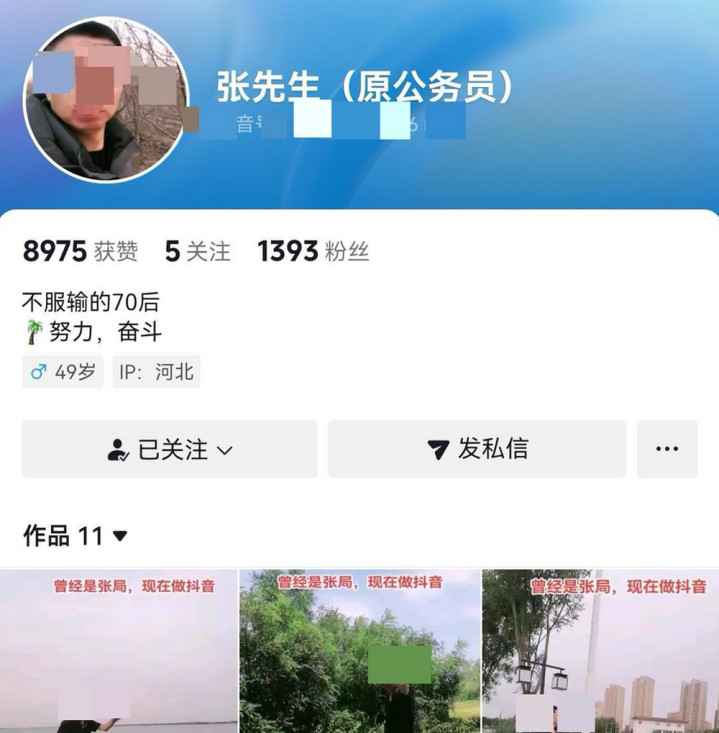 极目新闻记者注意到,这个张先生(原公务员)的抖音账号,从今年6月初至今,已发布11条短视频。“曾经是张局,现在做抖音。”这句话成为每条短视频的标配。视频内容,基本上都是在街头跳跃的镜头,有网友称其“无厘头”“博眼球”。每条视频评论区的顶部,都有网友称他6年前因伪造国家证件、印章罪被判有期徒刑7个月,并处罚金5000元的事。